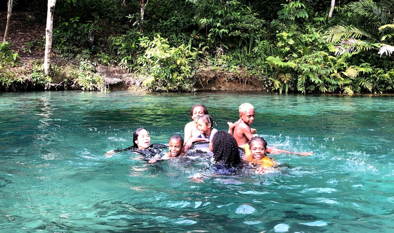 Sesampainya di sana, saya tidak langsung mandi. Setelah perjalanan yang lumayan jauh, kami istirahat terlebih dahulu sambil ngobrol dengan beberapa warga lokal. Ternyata, berdasarkan informasi dari warga sekitar, ada dua spot Kali Biru yang bisa dikunjungi. Yang kami datangi adalah Titik Kali Biru 2 di Genyem, yang merupakan kepala ujung Kali Biru. Teman saya yang sudah lama tinggal di Jayapura juga baru tahu bahwa ada dua lokasi Kali Biru, dengan Kali Biru 1 terletak sebelum Kali Biru 2. Jaraknya tidak begitu jauh.